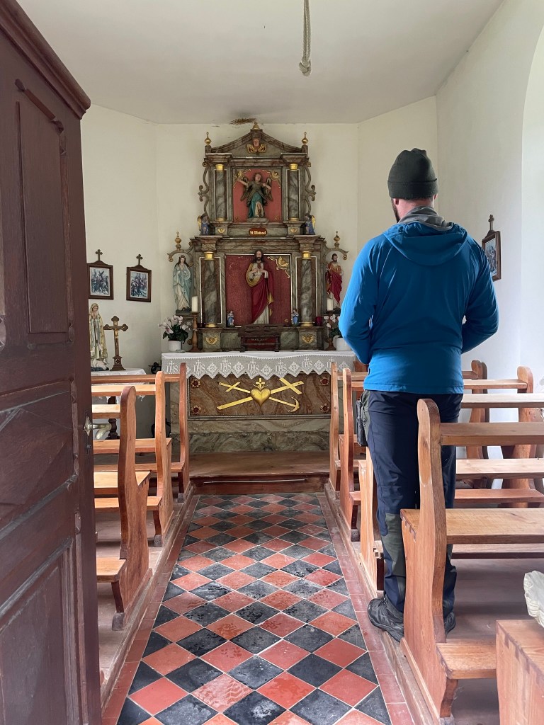 We parked near a residential area and noted how well-kept and big the houses were, how pothole-free the roads, and how there wasn’t a single bit of litter anywhere. The town centre was very pretty: old-fashioned street lamps and planters full of red geraniums lined cobbled pavements, and colourful buildings were punctuated by balconies, dormer windows and shutters. We found the information centre near a big pink-washed church and a primary school, where children played football despite the rain and didn’t wear uniforms. The man working there was very friendly and explained to us, in very good English, that there were dozens of signposted hiking trails in the area and that we should take two free leaflets – one a regional hiking map and the other containing descriptions of the corresponding routes – to navigate. We left wondering why England can’t implement such effective systems for tourists.