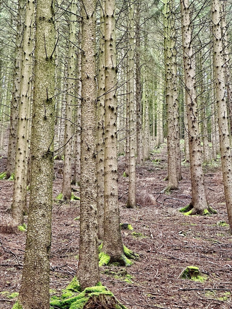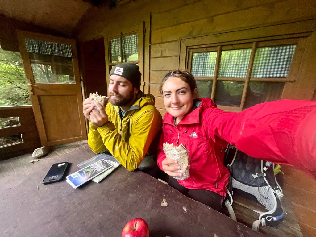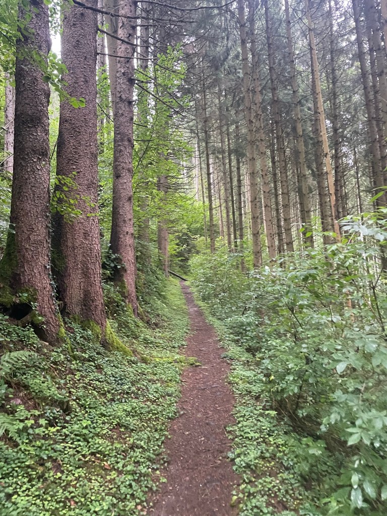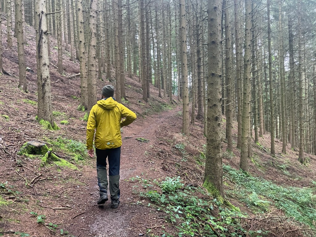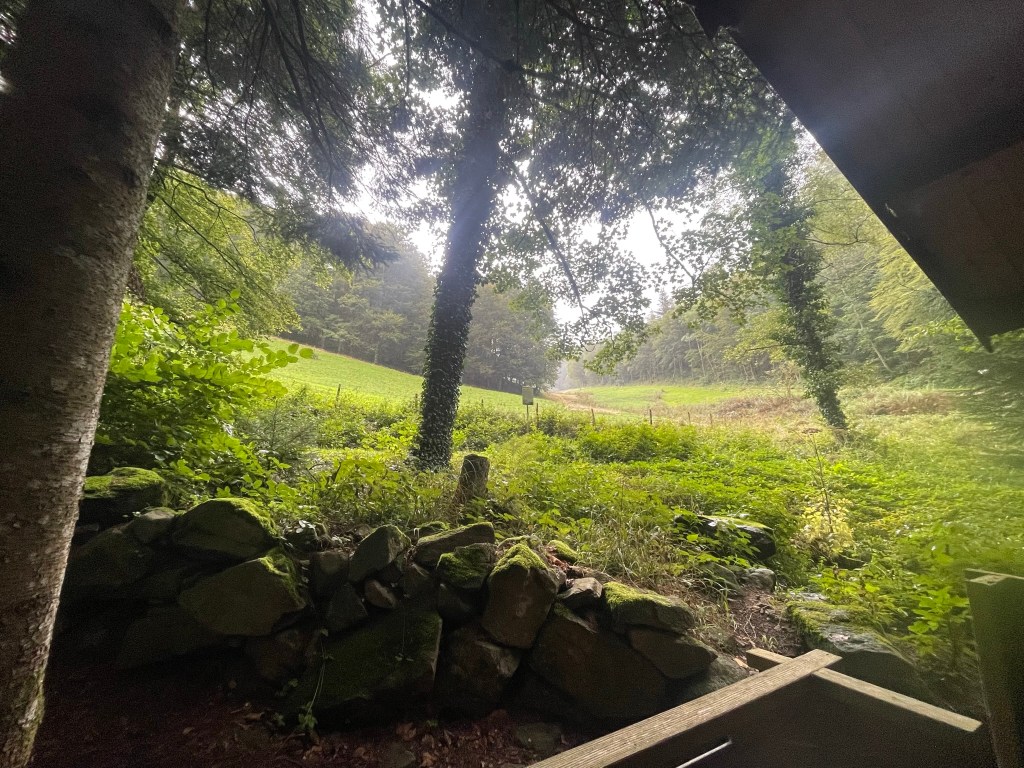 We sat in the porch and enjoyed ham and cheese sandwiches, sheltered from the torrential downpour that came in suddenly and swept over the meadow. When it seemed like the worst of the rain had passed, we continued through moss-covered, bracken-strewn pine forest for another kilometre, which was now dappled with soft sunlight that illuminated mosses, leaves and fronds in countless shades of green. We snaked down a steep switchback and emerged at the crest of a small ridge that looked up the Elz valley. Its lower reaches were carpeted by astonishingly green fields which rose into thick, dark forest on both sides, and a tiny road lined by spaced-out, red-rooved buildings wound up the belly of the valley towards hazy blue hills at its head. It was fairytale-like: