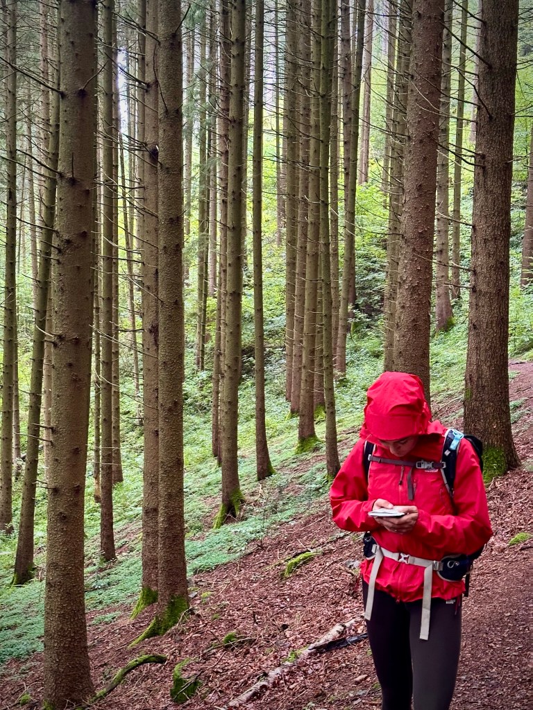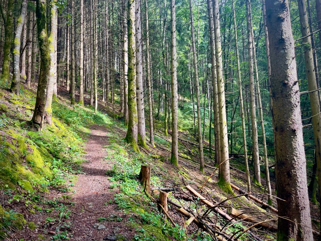 We picked a short 5km loop – “heimatkundlicher wanderweg” – that started in a village 10 minutes up the valley, Oberprechtal, and encompassed 18 information boards (all of which I translated with an app) detailing the nature, culture and geography of the area. We climbed above the village and followed a clear path into the forest, which at first consisted of leafy ashes, hazels and brambles, then tall, dense pines with linear trunks that stretched straight upwards, emphasising the steepness – about 30 degrees – of the valley sides. We passed a sloping bank of moss-covered rocks and came to a small, wendy-house-like cabin looking upwards to a grassy, forest-lined meadow. It was very Hansel and Gretel and we couldn’t resist.