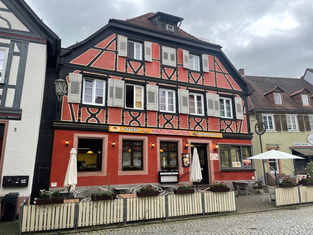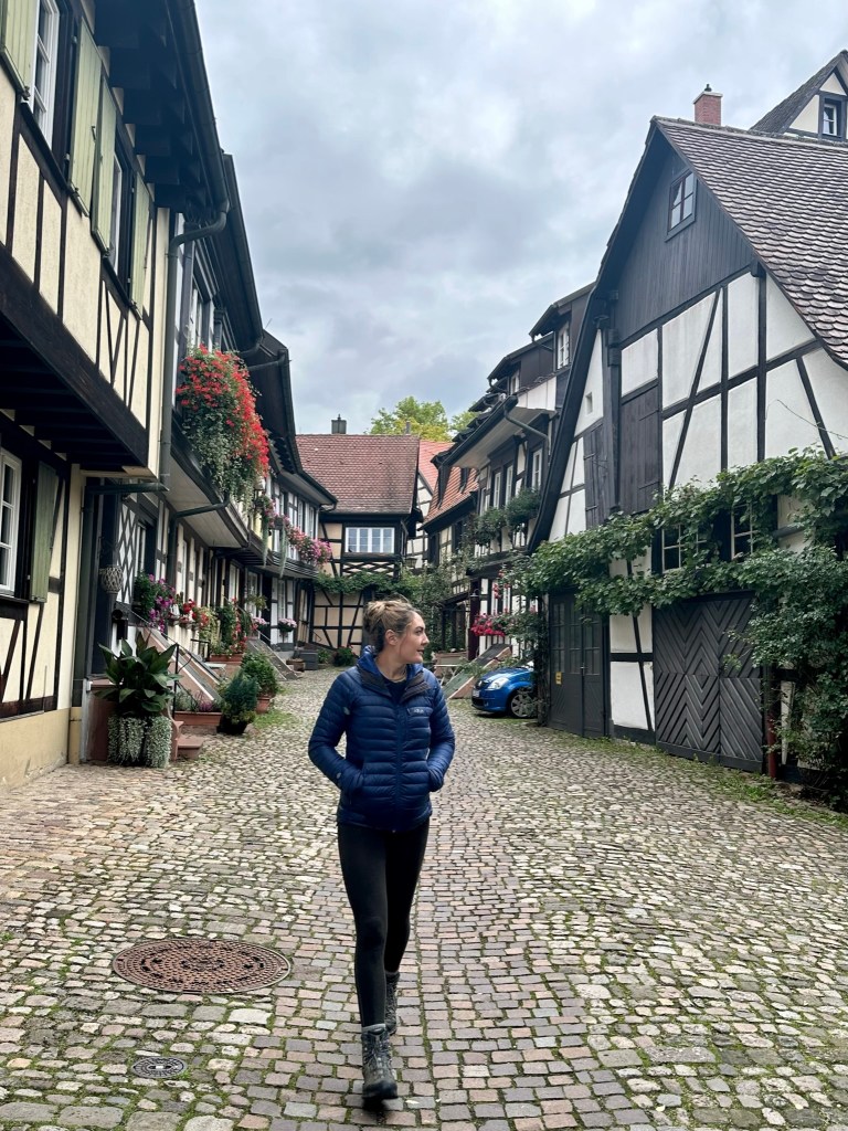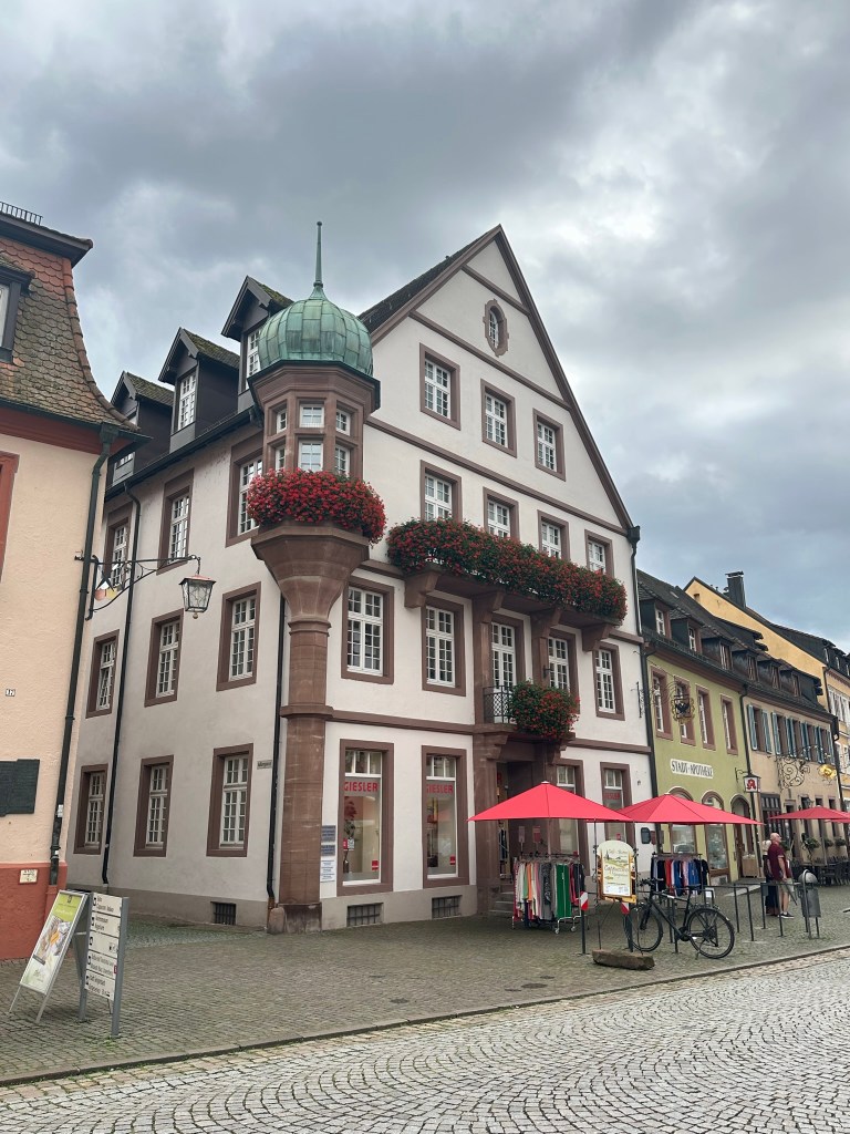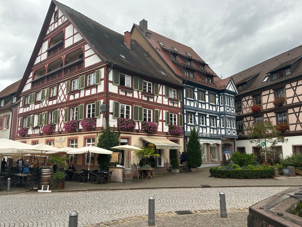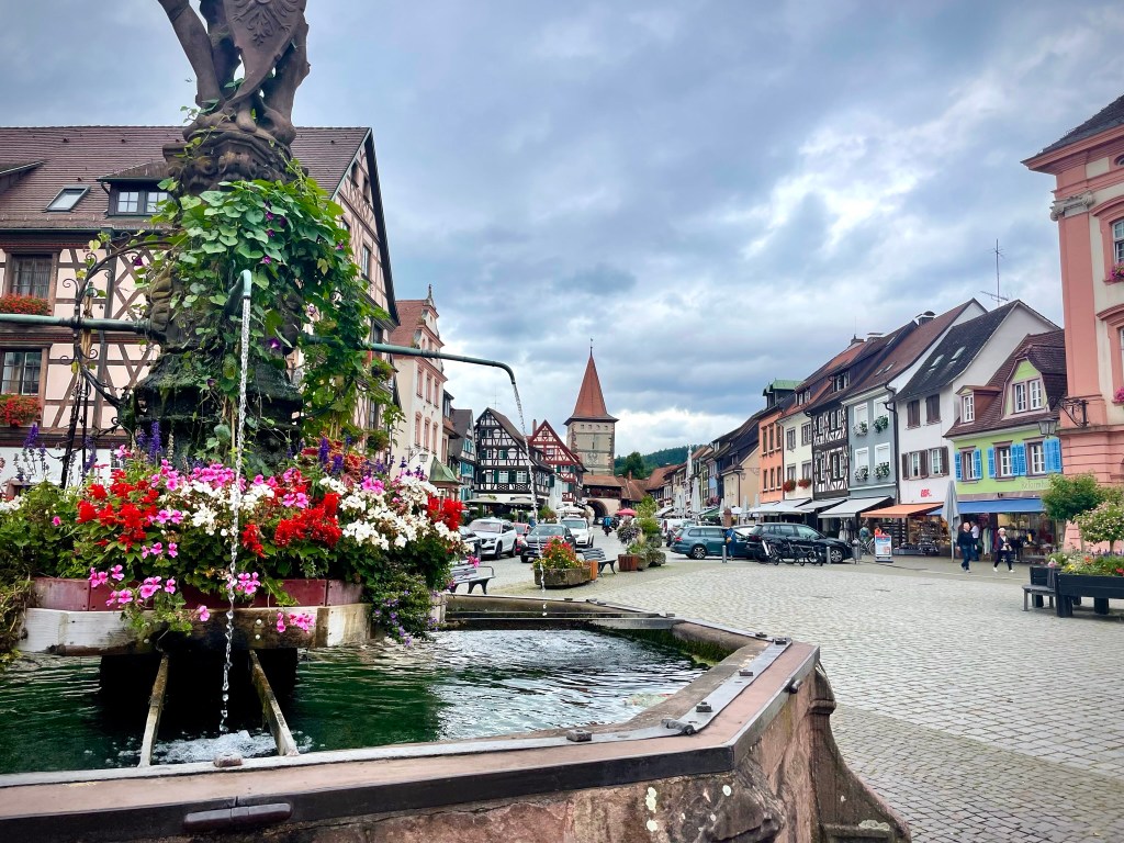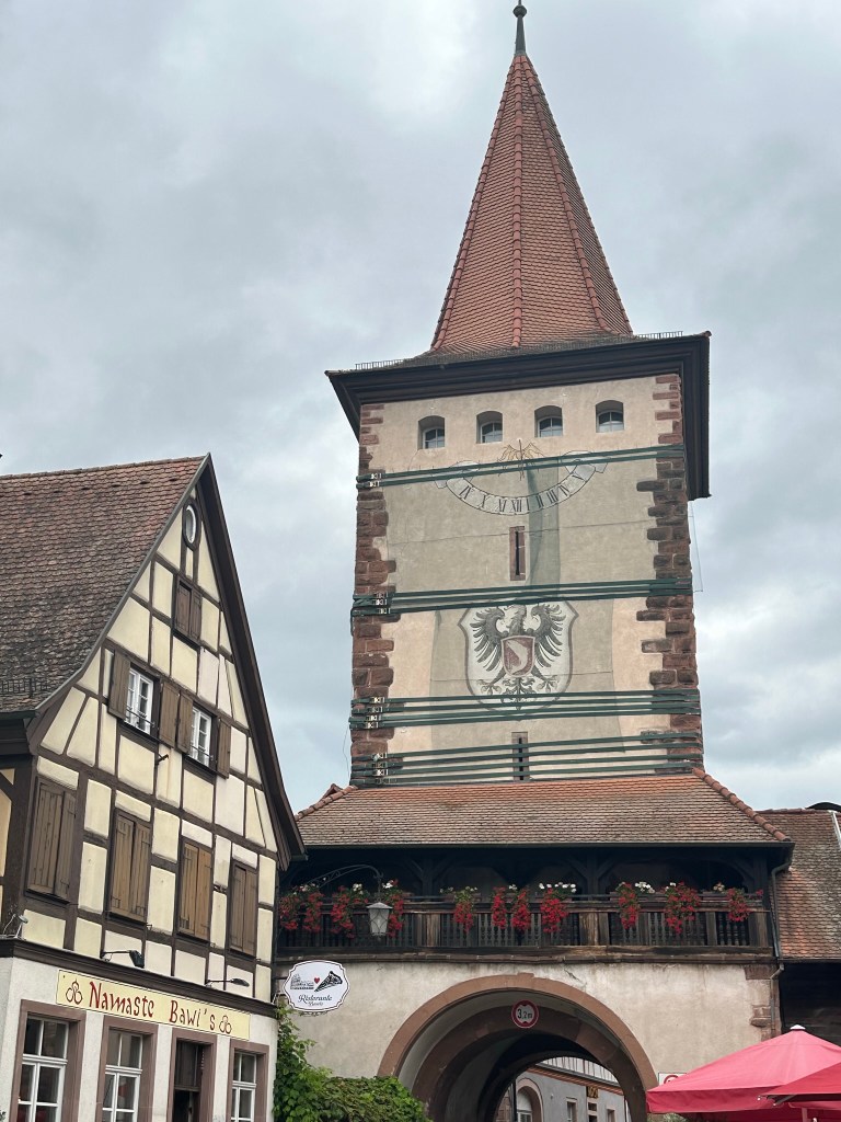 We entered the town through a gateway with a raised portcullis beneath a high, square tower – the Kinzigtor – which was painted white and decorated with a splay-winged German eagle and three coats of arms. It felt as if we’d stepped into a fairytale. Colourful buildings with painted shutters and hanging lanterns lined the wide, cobbled street, which converged with two other streets at the central market square. I’d never seen a place like it – there were so many focal points, and nothing was uniform but everything was perfect.