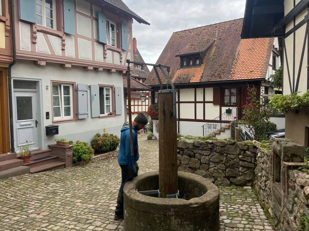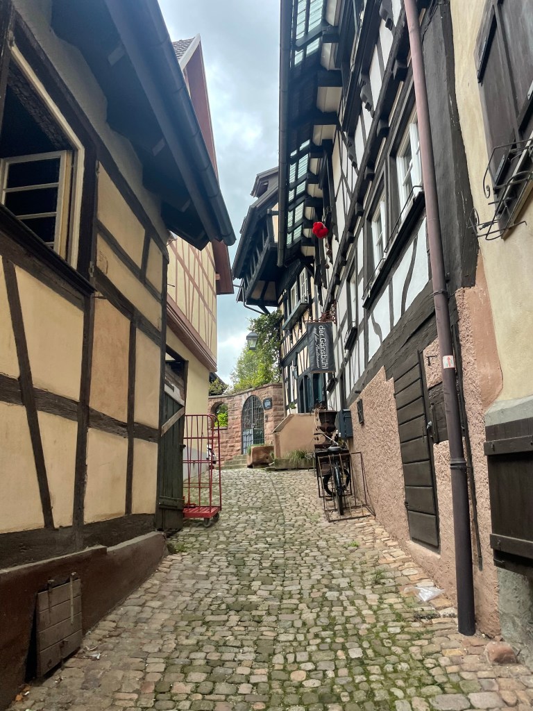 We passed shops selling clothes, shoes, books and souvenirs, all with little canopies stretching over the pavement, and bustling cafes that spilled out onto the street. There were plants everywhere, filling stone troughs lining the paths, in pots outside restaurants and cafes, and flowerboxes decorated the windows of most buildings. We turned left along a narrow alley just before the tower, poked around an old stone well with a wooden pump that looked like it worked, and wove through narrow, cobbled alleys lined by timber-framed houses back to the main street.