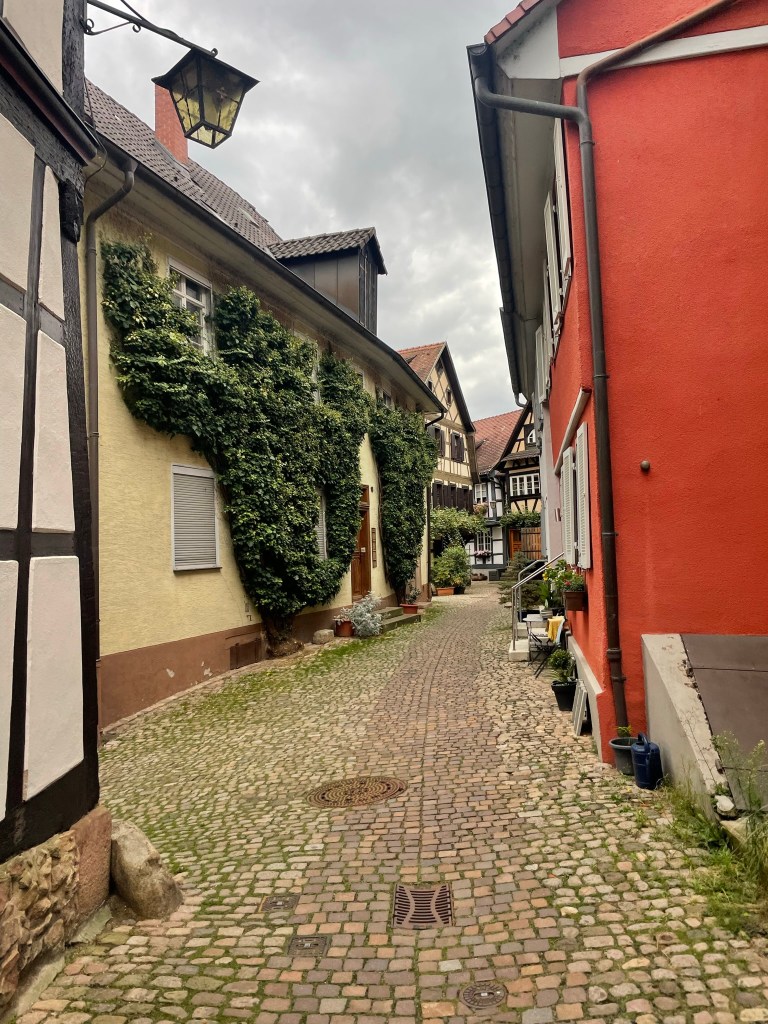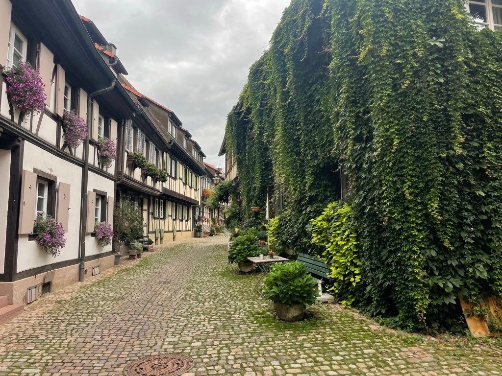 Charmed by the quaintness of every nook and cranny, we took the next turn and found ourselves down another surreal alley. Large lanterns protruded from the beams of houses and climbing greenery covered many of the walls, seeming to emanate from the cobbles. Grapevines crept above wooden front doors and the residents seemed to compete over who could encroach on the street with the greatest abundance of potted shrubs and geranium-lined windows. I wondered why any architect or town planner would ever deviate from such aesthetic perfection – if only every town looked like this.
