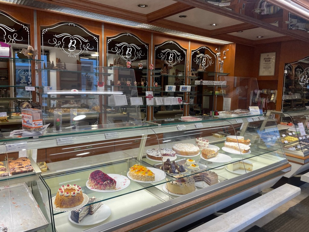 We emerged on Haupstrasse, the other main street off the central marketplace, popped into a little supermarket for a drink, then were lured into a lovely, old-fashioned bakery. The tiny old lady smiled patiently through my attempts to communicate which bread I wanted and asked (via gestures) whether we wanted it sliced. Resisting the delicious-looking cakes and pastries, we left with a loaf of sliced walnut bread, which we later found to be divine. We returned to the car via the marketplace and the Kinzigtor, utterly enchanted by Gengenbach.