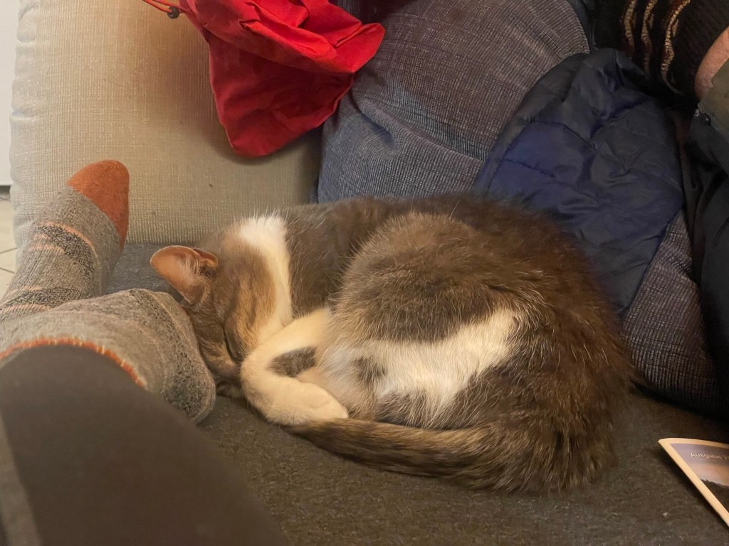 I opened the balcony door and the cat promptly entered – the host hadn’t mentioned it and I assumed, by the way it padded around and settled immediately on the L-shaped sofa, that we were the ones imposing on its private space. I made coffee and, on opening the fridge door, had to extract both milk and the cat. There was a jar of sauerkraut leftover from last night’s dinner (chicken schnitzel with potato salad and sausage kale, cooked by Ryan while I recovered from the drive) which inspired the cat’s temporary name – Kraut.